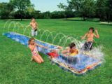 A stream of water seperates the kids as they splash into a pool of water. Water Slip Water Slide for Kid Adults 15FT Racing Lanes and Splash PoolOutdoor Water Toys Colorful Slip Slide Play with Plash Sprinkler Garden Backyard Giant Racing Water Slide with Spray Blue 2399 23. Banzai Splash N Slide Sprinkler Park lets you have the ultimate summertime backyard block party.